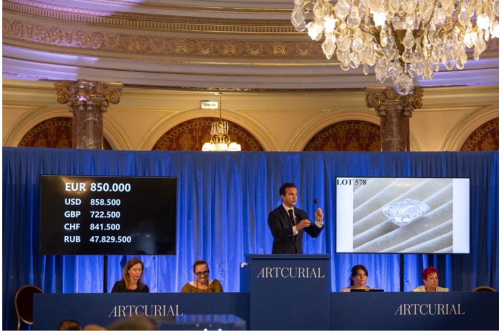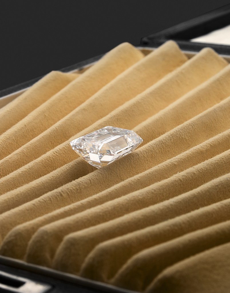 Emerald Cut diamond weighing in at 17.5 carats was sold to a European collector for US$1,294,561. Photo courtesy Artcurial. Handout via The Gourmet Gazette