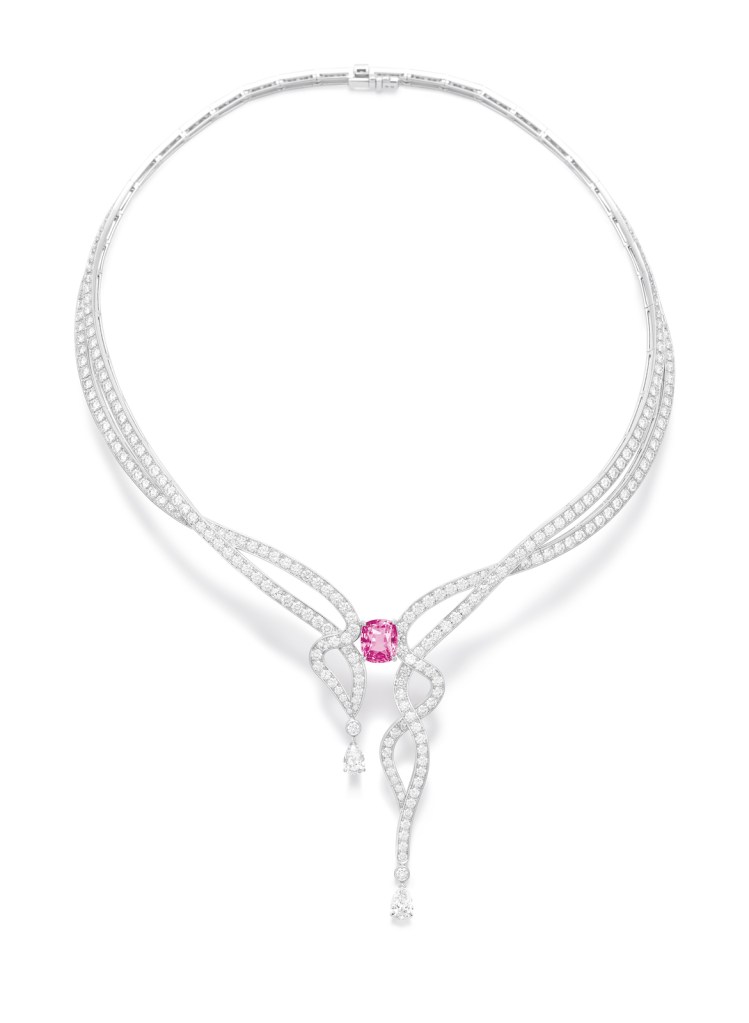 Deep greens and blues, dark reds and pinks, colors of the night sky come together in this once again exceptional collection, shining bright into the night.The hallmarks of the house are all here for an exceptional rendezvous: remarkable precious stones, delicate settings, high craftsmanship all from Piaget’s Ateliers de l’Extraordinaire where gold is sculpted and fashioned. From here emerged the Voluptuous Ribbon and Generous Laces adornments. The feathers of the Extravagant Touch watch can metamorphose into earrings, The central piece of the Flamboyant Nightfall necklace can be clipped on to the setting of a ring. The masterpiece Dazzling Swirl timepiece houses a tourbillon beneath a pavement of diamonds.