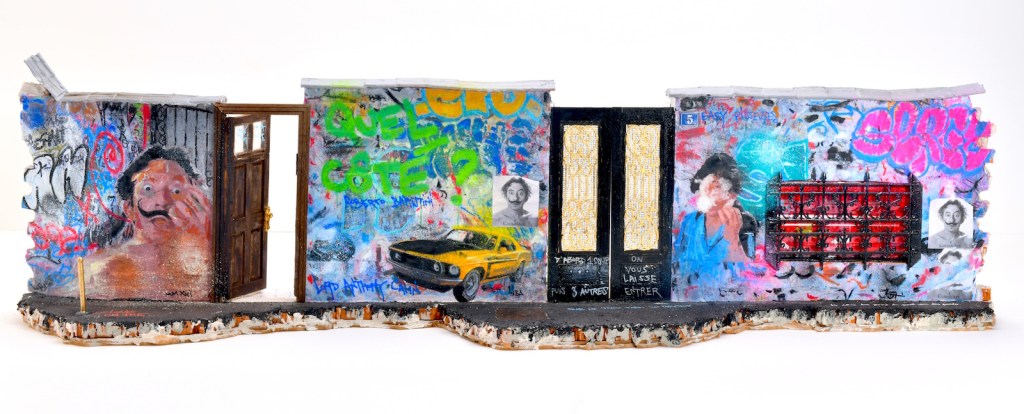 A highlight of the show is a meticulous sculpture of Serge Gainsbourg’s home on the rue de Verneuil from Lord Anthony Cahn. The home has been a prime Parisian hot spot over the years, even when he was living there, as fans and friends could leave their own marks and tributes on the home’s outer walls which is what Lord Anthony Cahn did, covering the sculpture with his own signs and symbols and graffitis. The collector who acquires this work will also be given a property deed to the house. The house, regarded as a shrine as nothing has changed inside or outside since Gainsbourg’s death in 1991, is currently being converted into a museum. Meanwhile the show, entitled Gainsb’art, a word play on his nickname Gainsbard, is being held inside the Yoxeone Art Gallery, which is also a highly original concept store, until November 15th.
