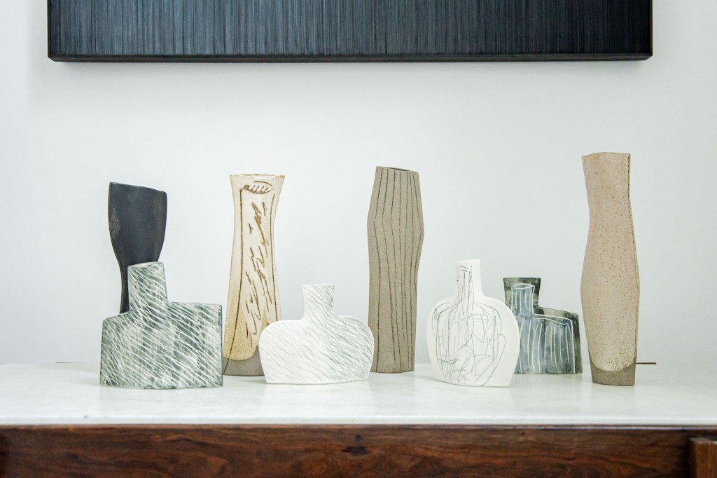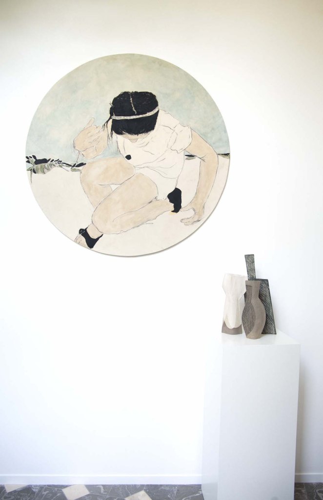 The current show running until October 31st, juxtaposes a selection of works by the Italian sculptor Guido De Zan and the French artist Juliette Lemontey. Both use warm and soothing tones in their respective mediums. Juliette Lemontey draws and composes on antique linen while Guido De Zan has worked for over 40 years in ceramic researching the material while questing to make it lighter despite its inherent fragility.
