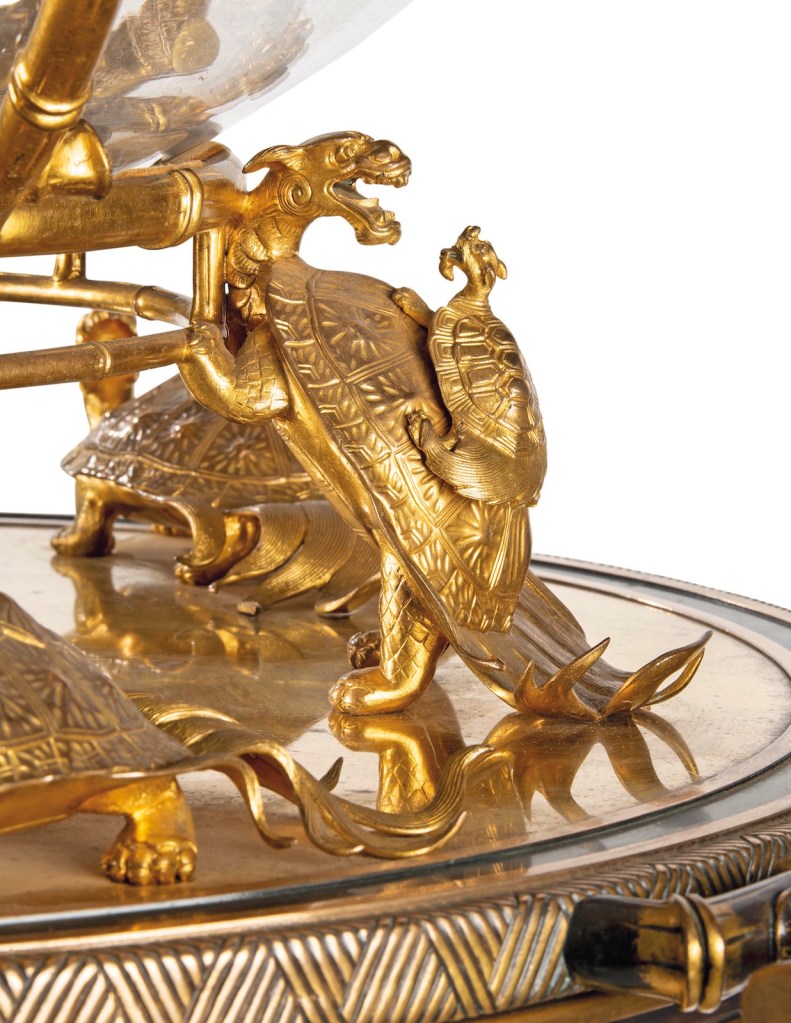 The sphere-shaped aquarium in smoked glass is decorated with bambou branches upon which myriad turtles both small and large sit with the sphere sitting on a pedestal decorated with dragons all standing on three finely engraved elephant heads. On the cardinal points of the object identical mounts set in a square decor of bamboo is a disk of the ideogram shou, the Chinese symbol of longevity, like the turtle.