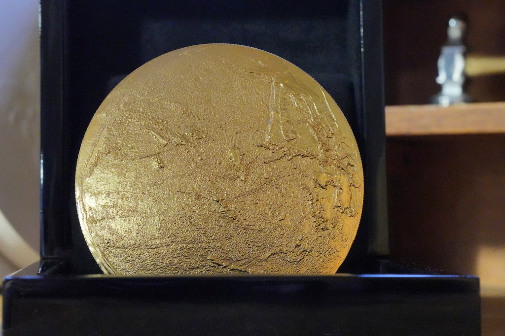 The competition was held for the second time this year with the winning medal imagined by French designer Pierre Charrié revealed in a ceremony last November 17th. Pierre Charrié drew his inspiration for the medal from the tradition of satirical medals and 16th century engravings. The medal, christened The World Overturned, is asymmetrical and was difficult to fashion because of its various widths. The designer’s initial inspiration for the medal was the bronze mirror which predated the glass mirrors of today, explained the designer. The front of the medal is concave and contains a quote from Hegel, « The False is the Moment of the True », while the back depicts the depths of the Pacific Ocean with the South Pole on the top and the North Pole on the bottom. The medal has been brought out in a limited edition of seven pieces, one of which will remain on display at the Mint.
