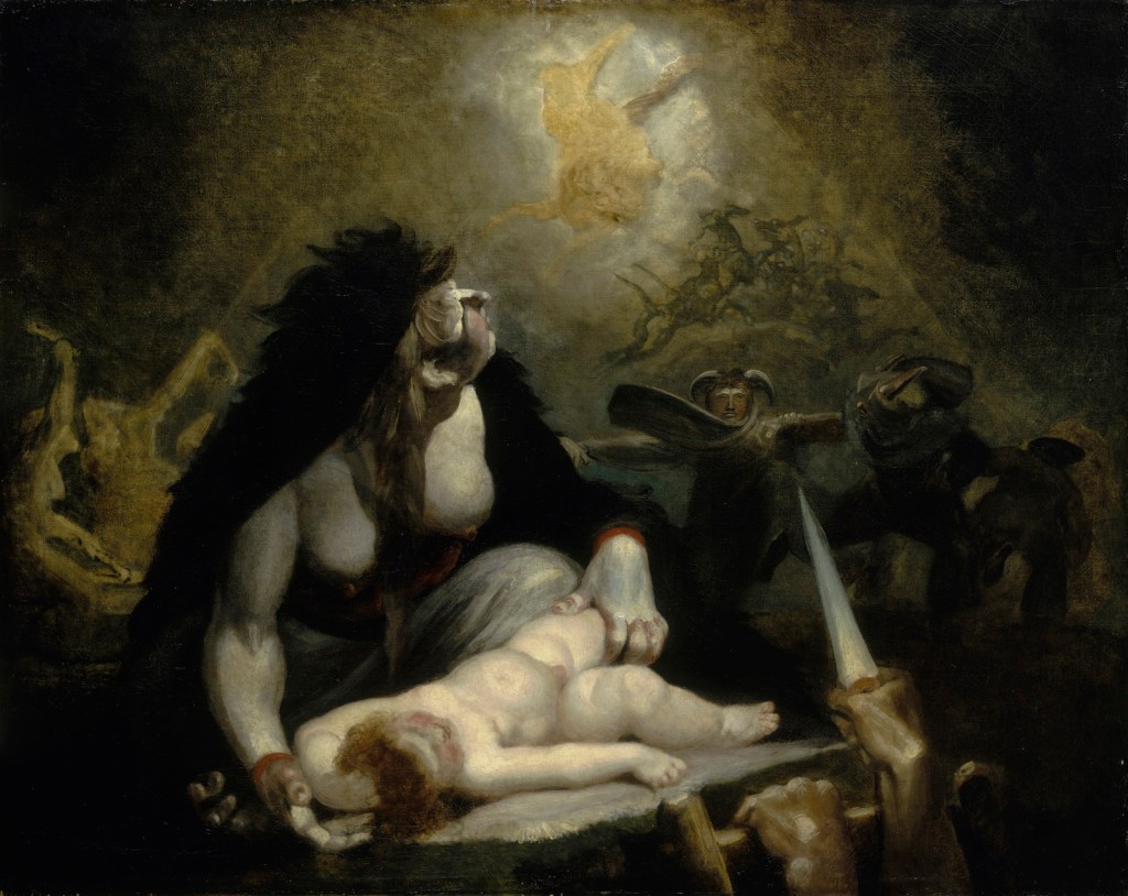 He was also quite the man of letters well versed in the Bible and Nordic mythology a case in point being his Thor Fighting Against the Midgard Serpent. But nightmares and witchcraft would play a role in some of his most memorable works. His famous Nightmare was first presented in 1781, potent, erotic and horrific it features a frightening incubus on the stomach of a well-articulated woman in a clingy white nightgown with a horse (a night mare?) poking its head through the curtain behind the bed. The Gothic would go on to become key elements in his works which explored sacrificial rites and depicted demonic and mysterious creatures.