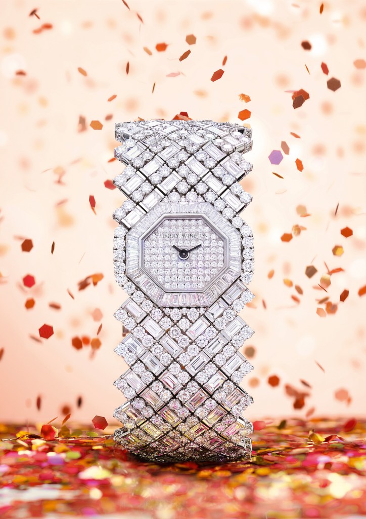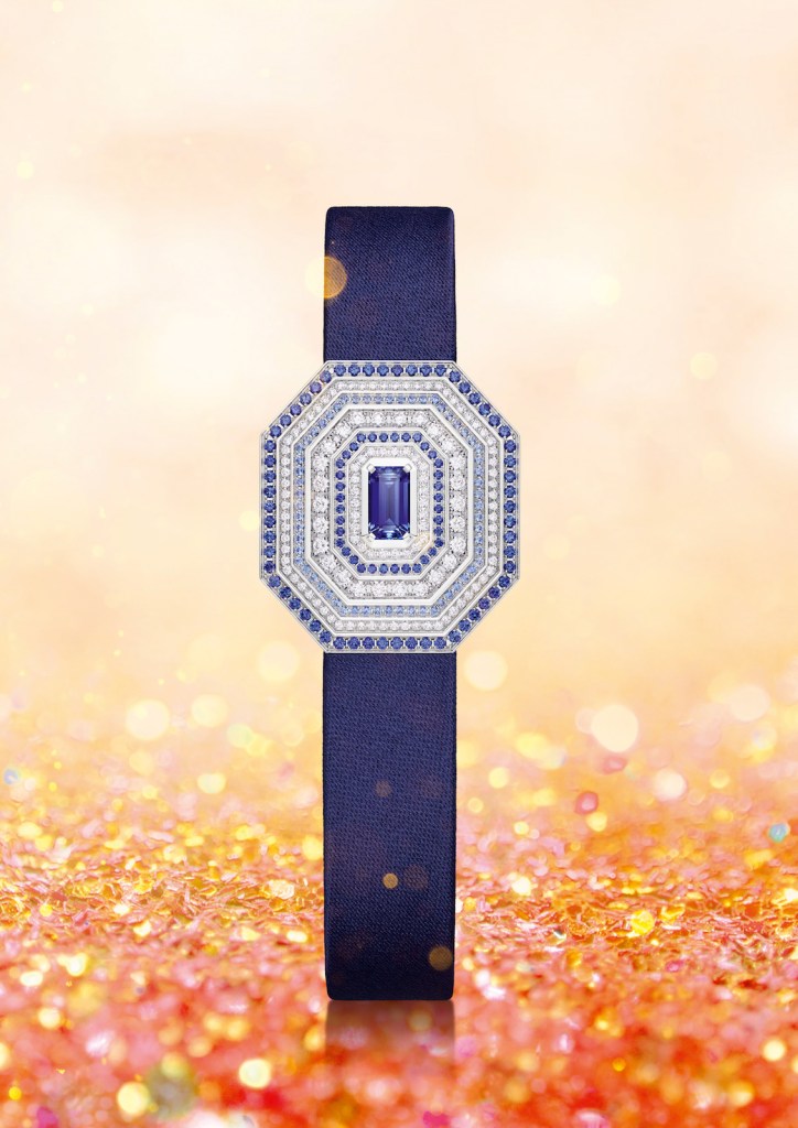 Left: The Emerald Signature timepiece by Harry Winston with 158 brilliant-cut blue sapphires and a central emerald-cut blue sapphire and 185 brilliant-cut diamonds. Photo ©Harry Winston. Handout via The Gourmet Gazette. Right: The Tête-à-Tête by Harry Winston high jewelry time piece in platinum and diamonds. Photo ©Harry Winston. Handout via The Gourmet Gazette