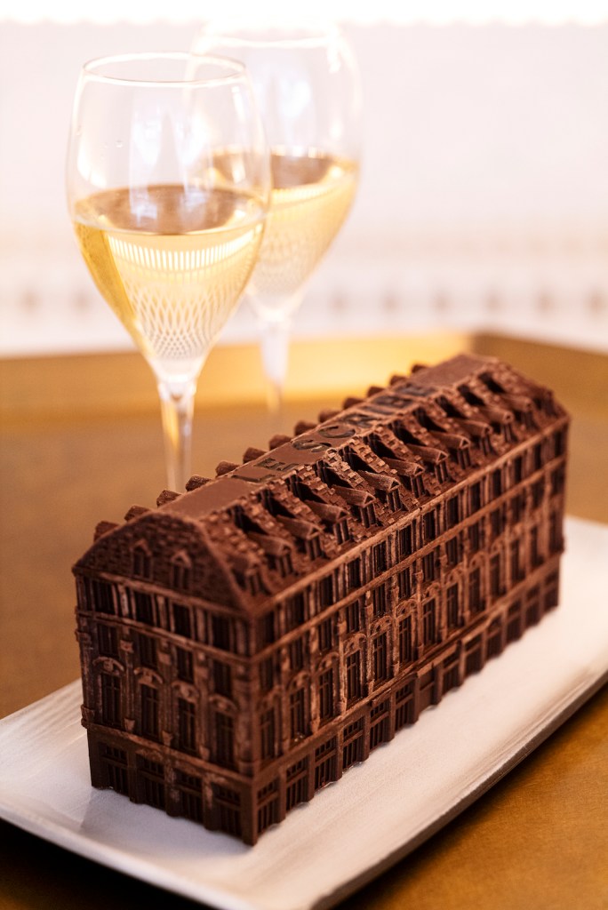 This year the Yule Log cake at the Sofitel Le Scribe Opéra was a wondrous creation of chocolate and more chocolate in the effigy of the hotel itself. The dark chocolate building sits upon a brownie cookie base and is filled with coffee flavored crunchy cake, Nicaraguan chocolate cream and caramel and coffee cream and a cappuccino mousse. And the sous chef pastry chef Antoine Bouchard added another resounding note, the cake was a version of the famous Opéra pastry in honor of the hotel’s location behind the Garnier Opera House.