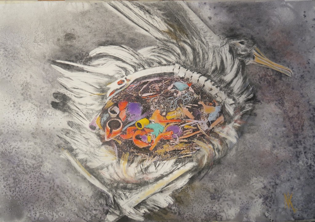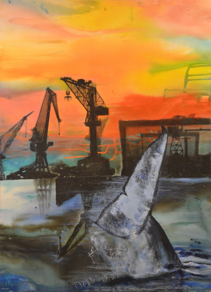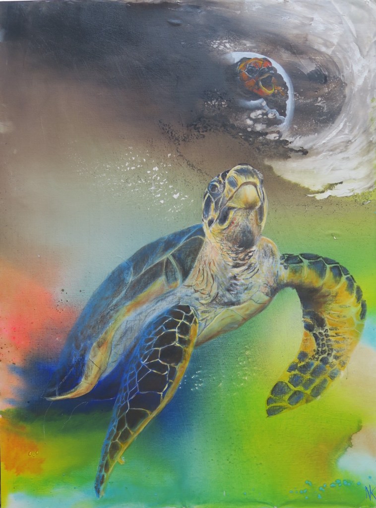 She is one of the leading ecological artists of her generation and the vivid world played out in her activist art works intrigue and educate at the same time. Les grues & La baleine (the cranes and the whale) is a vivid depiction of oil drilling platforms with a whale sinking into petroleum filled waters, evoking the sick whales that wash up all too often on our shores. It is her use of color that stands out immediately. The highly potent painting of an albatross, its stomach filled with the garbage — much of it plastic — that has accumulated in our seas is heart wrenching and yet perfectly executed. Caretta evokes the two ecological phases of a turtle, one swimming, the other seemingly choking. Marine turtles are highly vulnerable to the plastic and fishing nets and general pollution found in our seas.