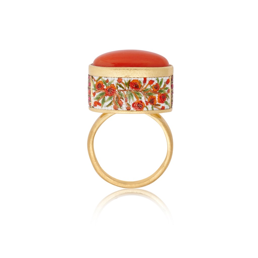 The Secret Garden Ring from Le Sibille with Mediterranean coral, rubies, orange saphires, micro mosaics and 18k gold. Photos courtesy Le Sibille. Handout via The Gourmet Gazette