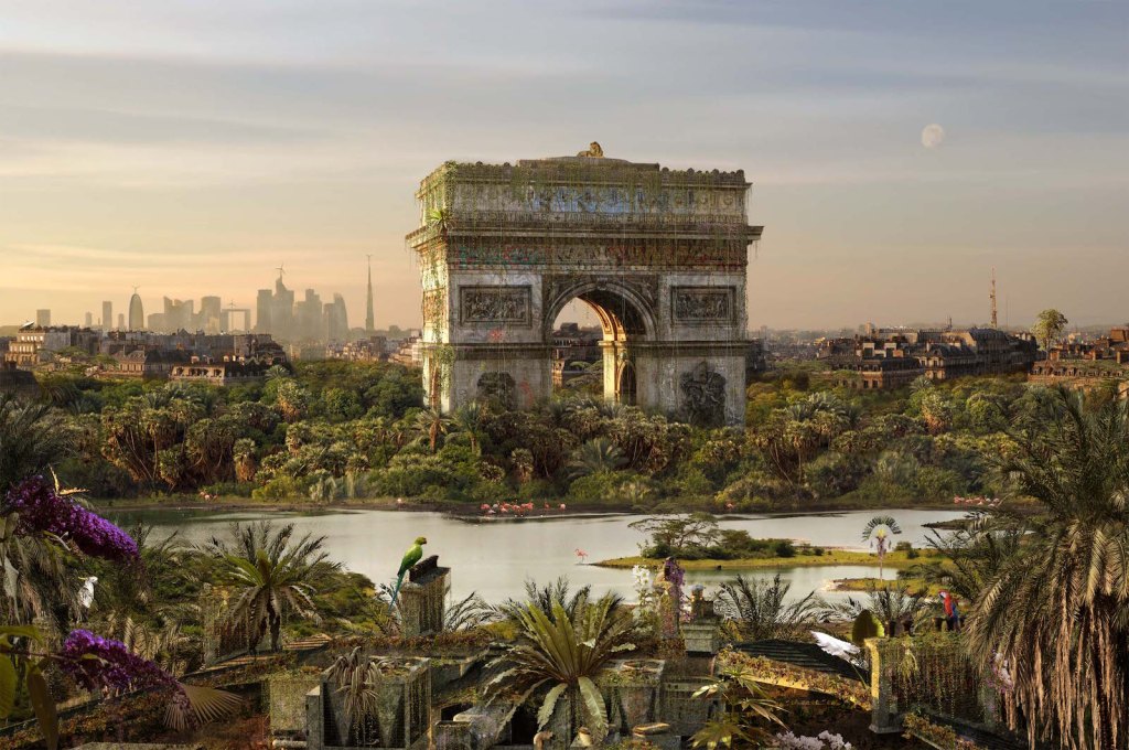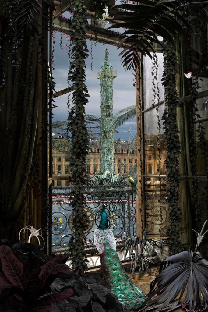 Paris, France — Imagine an urban landscape filled with trees and shrubs and plants and birds. Imagine the Arc de Triomphe in Paris surrounded by a flamingo filled lake and lush vegetation and with a lion perched on its top. A Triumphant Arch where a peacock spreads its feathers. A giraffe grazes in front of the Pyramid of the Louvre. This is a world that has been imagined by Chris Morin-Eitner. The contemporary artist/photographer’s works are being showcased in a solo show entitled Once Upon a Time Tomorrow (Il était une fois demain) being held at the Galerie W in Paris.
