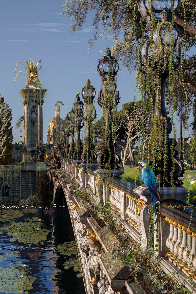 Chris Morin-Eitner dreams of a world in the future in which nature emerges into the city. Something which did happen to a certain extent during the Covid-19 pandemic’s periods of confinement. Inspired by the ancient city of Angkor where greenery and vines creep in and out of the ancient temples, transforming the site into a poetic ode to nature, he creates dreamy greenery-filled worlds. « Angkor, invaded today by vines and filled with poetry and tomorrow what will Dubai, Shanghai, Rome and Paris become?, » asks the artist.