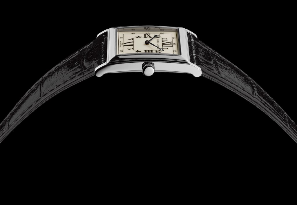 The Swiss-made watches embrace the elite traditions of Swiss horology and the 28mm and 32mm timepieces are powered by an extra-flat mechanical manual winding Swiss movement that has been hand finished with vertical Côtes de Genève stripes and circular graining, known as Perlage. Outfitted with an interchangeable shiny black alligator strap, the watch is perfect for dressing up with its sterling silver or 18k rose gold buckle. Its lacquered white dial is made up of concentric squares with Arabic and Roman numerals.