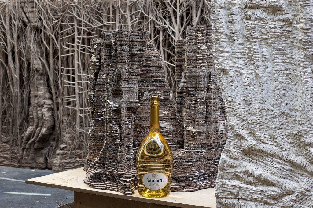 Paris, France — It is that time of year when the oldest of the champagne houses releases its limited edition bottle for its fabulous Blanc de Blancs champagne, the house’s specialty. This year the house has worked with French contemporary artist Eva Jospin to create a Jeraboam brought out in a limited edition of 25 signed and numbered bottles. For Ruinart is not only known for its fine champagnes, it has for years been a patron of the arts. The boxed limited editions were unveiled during an ephemeral exhibition at the Carreau du Temple in the Marais neighborhood of Paris last March 10th to the 12th. The exhibition, entitled Eva Jospin’s Invitation for a Champagne Promenade, presented her monumental yet delicate works offering up a vision of the Ruinart terroir. The artist employs nature and especially forest themes in her works which are often made of cardboard.