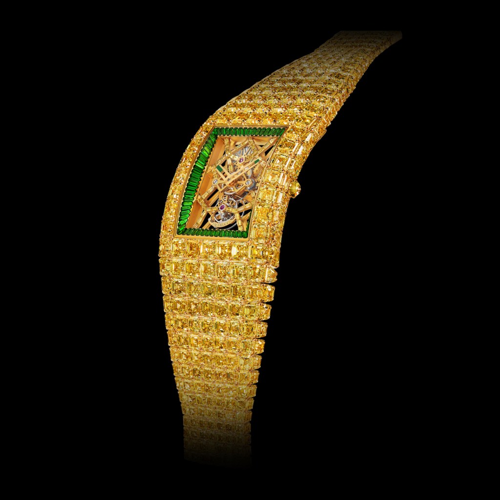 The quest required that the diamonds be of uniform color, perfect quality and incredibly bright. 880 carats of rough yellow diamonds were transformed into 216.89 after thousands of hours of cutting them into the demanding mirror-like Asscher cut. This cut is characterized by wide step cuts, near perfect square symmetry, and the high crown according to the International Gem Society. It was invented by the legendary diamond cutter Joseph Asscher, founder of the I J Asscher Diamond Company. It became popular in the Art Deco era. Three and a half years in the making, this timepiece of 425 Asscher cut, fancy yellow and fancy intense yellow diamonds proved to be an undertaking of Herculean proportions with the result being nothing short of divine. Meanwhile the Billionaire skeleton tourbillon movement is adorned with another 57 yellow baguette-cut diamonds. All of this adds up to an unprecedented achievement in the history of high jewelry watchmaking.