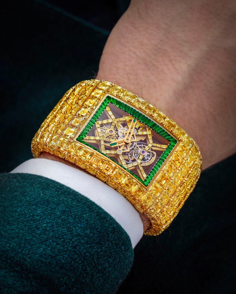 Meanwhile fancy colored diamonds, the family to which the yellow diamond belongs, are among the most valued and sought after gems on the planet for only one in 10,000 diamonds has a fancy color. Nitrogen that is incorporated into their carbon crystal structure gives yellow diamonds their color. But the Billionaire Timeless Treasure timepiece doesn’t stop with yellow diamonds. To make the timepiece even more spectacular, Jacob & Co. used one of its favorite gems, one that has now become a signature of the brand’s highest-end creations: the tsavorite. This rare green garnet adds to the watch’s unrivaled gem composition. 76 of them have been selected, emerald-cut and kite-cut, to surround the calibre JCAM39, the skeleton movement that Jacob & Co. uses in all its Billionaires which is regulated by a tourbillon that is so thin, so fine it might go unnoticed.