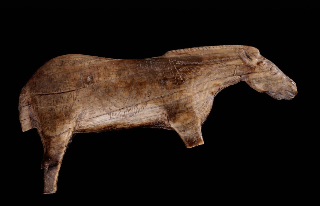 Mankind began painting and sculpting all over the planet as reproductions of cave walls and objects on the display in the exhibition demonstrate. But why did they do it: rituals for the hunt, magical rites or just humankind’s need to create? These are questions the show asks and the answers to them are far from obvious or unanimous. But what is evident is that they carefully chose their mediums, cave walls and objects, pieces of stone and their techniques. The study of prehistoric art is a relatively young discipline, dating from the end of the 19th century. Just over 100 years ago in November of 1922, the Venus of Lespugue was discovered and it is a centerpiece and one of the masterpieces of the exhibition. Timeless, it represents a kind of ideal woman or perhaps a primitive goddess. Cave drawings bring us into the lore and the glamorous lure of Prehistoric art. There are the great aurochs of Lascaux in France and what could possibly be a unicorn. The arts of Prehistory abound from the grottoes of France to the cliffs of Huashan in China to the canyons of Utah and beyond.
