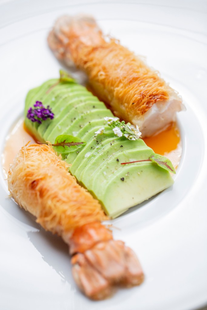 The house’s cuisine reflects the good earth and nature. The executive chef Fadi Frem works with finely sourced produce and products and creates thoroughly savory dishes with unique spices and seasonal flowers and herbs. Signature dishes include the line-caught hake with its delicate flavor from the fishing boats of the Basque town of Saint- Jean-de-Luz served in his Basque-inspired sauce. The veal chop in a simmering sauce that revolves around caramelized English ginger jam and Xeres vinegar also offers a marvelous main course with the veal coming from Qualiviande, a cooperative of 13 French livestock farmers. This is excellent served with the unctuous house pureed potatoes. There is also a hard to find Vol-au-Vent, puff pastry filled generously with farmhouse chicken from the Landes region of France in a creamy sauce. Another find is the tuna belly to share. But the appetizers are diverse and delicious, too, like the warm green asparagus or the memorable vitello tonnato and deliciously prepared langoustine straight out of the Atlantic.