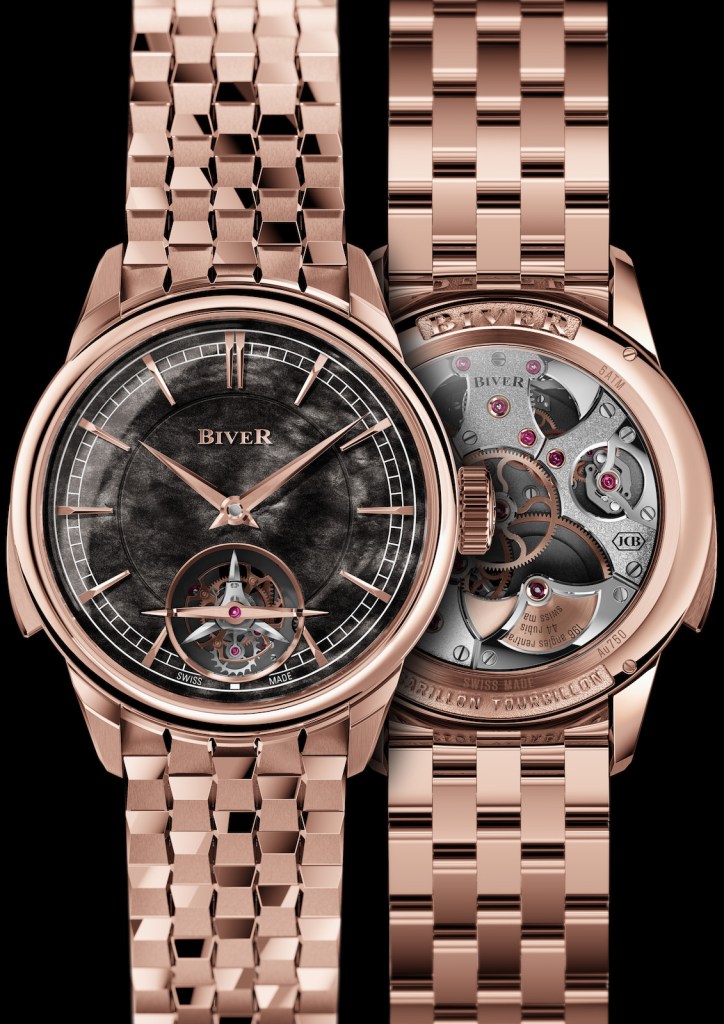 Left the Carillon Tourbillon Biver timepiece in sodalite with a titanium bracelet. Right: The Carillon Tourbillon Biver timepiece in silver obsidian with a rose gold bracelet. Photo courtesy Biver. Handout via The Gourmet Gazette