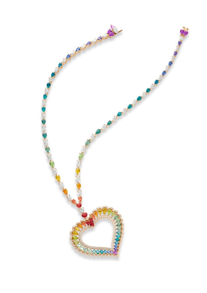 Today the heart is associated with love and romance, but for the Ancient Egyptians it was the heart that gave rise to all knowledge, from the movement of the arms to the walking of the legs and motion to all of the body which obeyed the heart itself. The house of Chopard has recently brought out two interpretations of the heart emanating from its Haute Joaillerie workshops. The sapphire and diamond necklace sparkles with a rainbow color gradient interpreted through the jewelry lacework that is a hallmark of the house’s Precious Lace collection. Meanwhile a ruby weighing in at more than 18-carats adorns a romantic ring. The necklace consists of a chaine from which a heart emerges with the ensemble made up of 75-pear-shaped sapphires selected for their colors to form a luminous rainbow gradient. The individual sapphires are surrounded by briliant-cut diamonds and the necklace is in Fairmined-certified ethical rose gold.