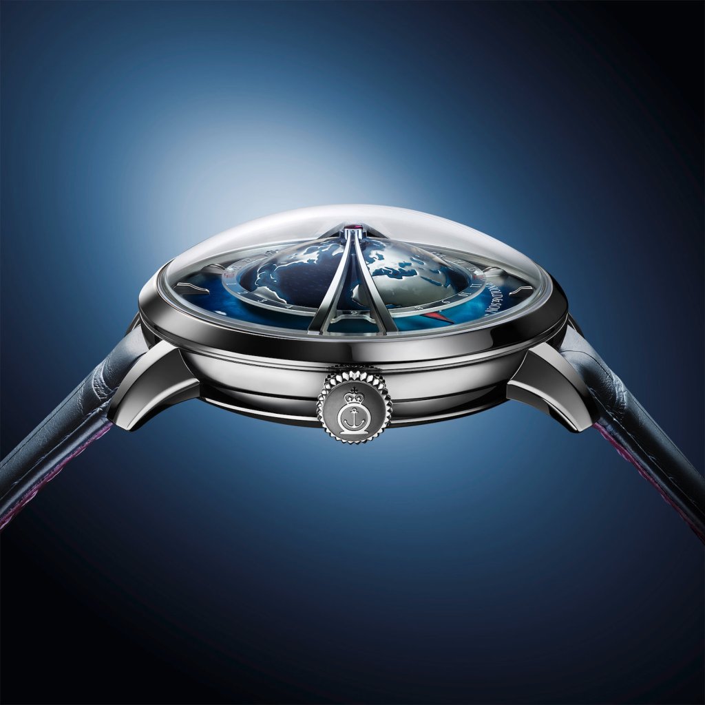 The relief of the mountain ranges is highlighted by a matt finish. The oceans, hand-painted with several layers of lacquer, are given intense depth and radiance by blue pigments enriched with powdered mother-of-pearl. The coastlines, in a lighter shade of blue and enriched with Super-LumiNova, shine at night and further accentuate the relief of this small hand-crafted work of art. The Globetrotter Platinum is equipped with the House’s automatic A&S6022 movement. The 22-carat gold oscillating weight features a skeletonized ‘Clous de Paris’ guilloché motif and the movement is also decorated with traditional fine watchmaking motifs.