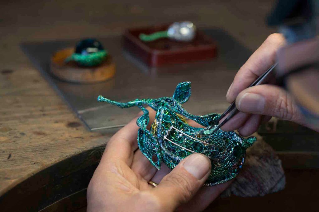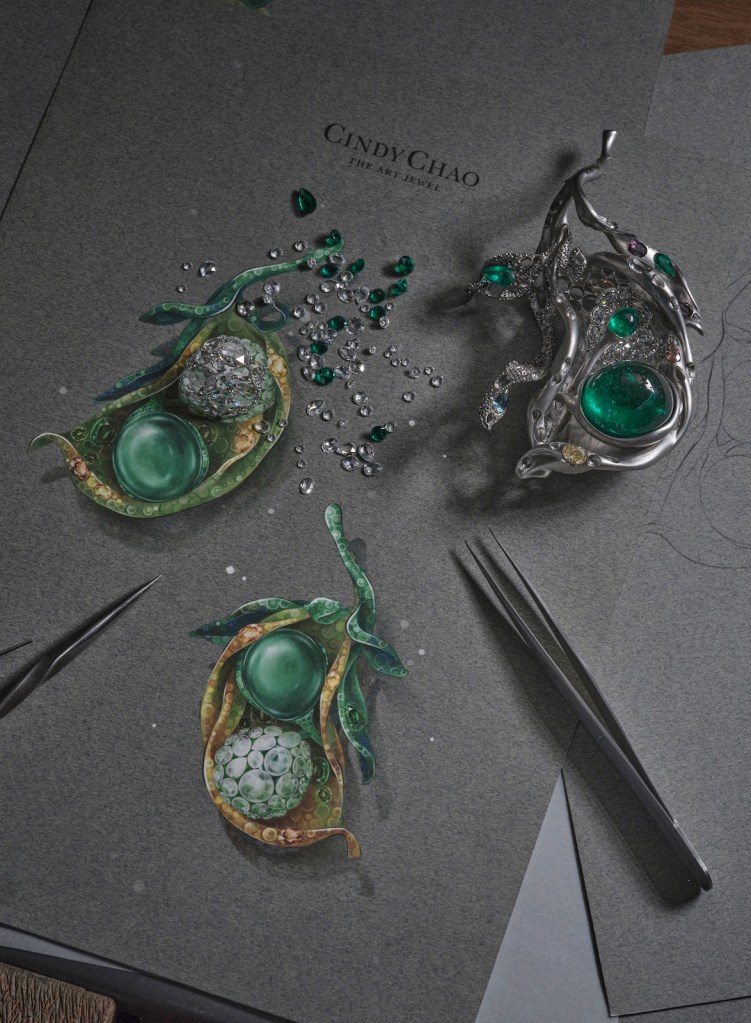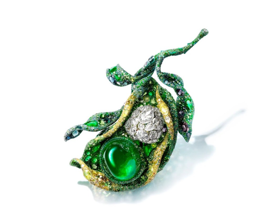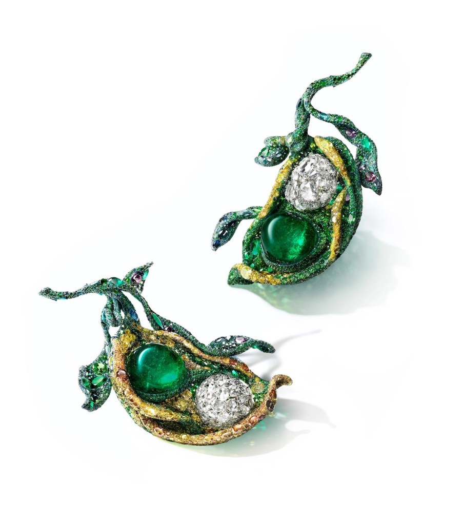 Cutting-edge craftsmanship and Colombian cabochon diamonds cone together in this springtime collection of jewelry from the house of Cindy Chao The Art Jewel. The Taiwan-based high jewelry maker has brought out its Spring Cardamom Brooches in its Black Label Masterpiece X and XI collections. Inspired by newly sprouted cardamom pods, the brooches come as a pair and bring together the vitality and hope of a new spring. They are crafted in the shape of a budding pod with an undulating silhouette.
