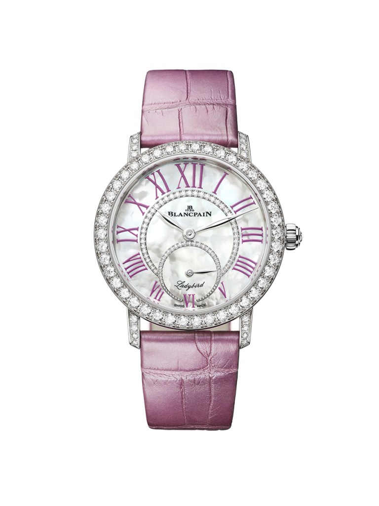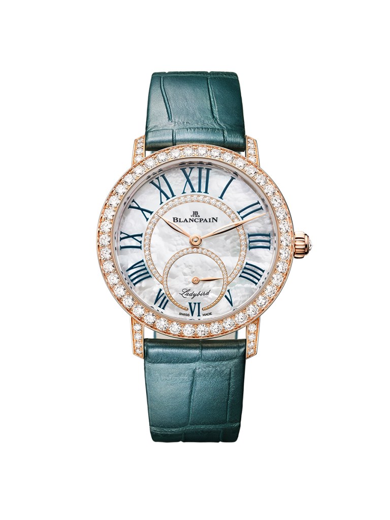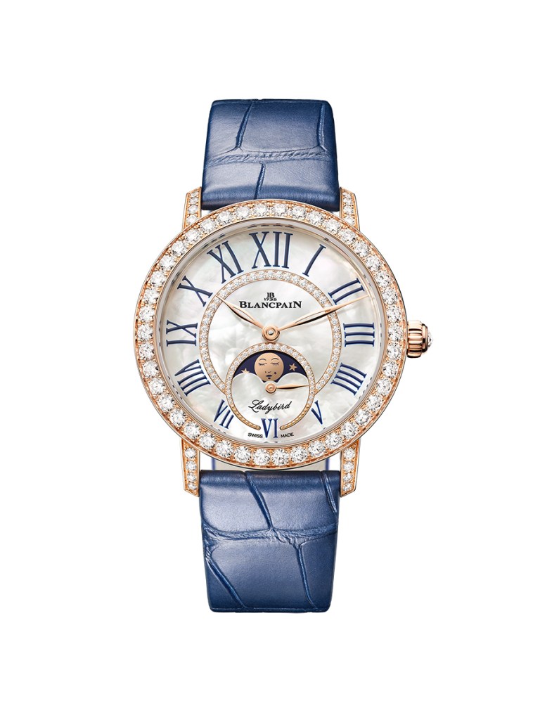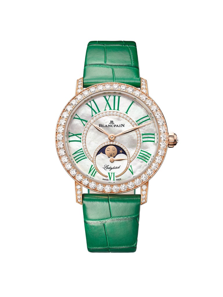 The house has recently brought out some fabulous color combinations in its Ladybird collection fittingly entitled Ladybird Colors. One version displays two new small seconds hands and in another version displays a moon phase complication. The textured mother-of-pearl dial set with 70 diamonds features colorful midnight blue, peacock green, forest green, lilac or turquoise Roman numerals and these variations are picked up on the straps of these red or white gold models.