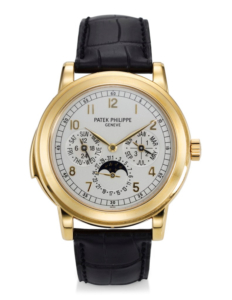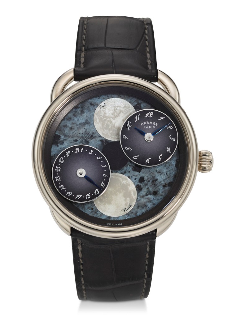 Left: Hermès, Arceau l’heure de la lune, a fine 18k white gold wristwatch with dual moon phases, date, and blue mother-of-pearl dial. Photo ©Christie’s Images Limited 2023, courtesy Christie’s. Handout via The Gourmet Gazette. Right: Patek Philippe, “Cathedral,” a very rare 18k yellow gold perpetual calendar minute repeating wristwatch with moon phases and 24-hour indicator. Photo ©Christie’s Images Limited 2023, courtesy Christie’s. Handout via The Gourmet Gazette