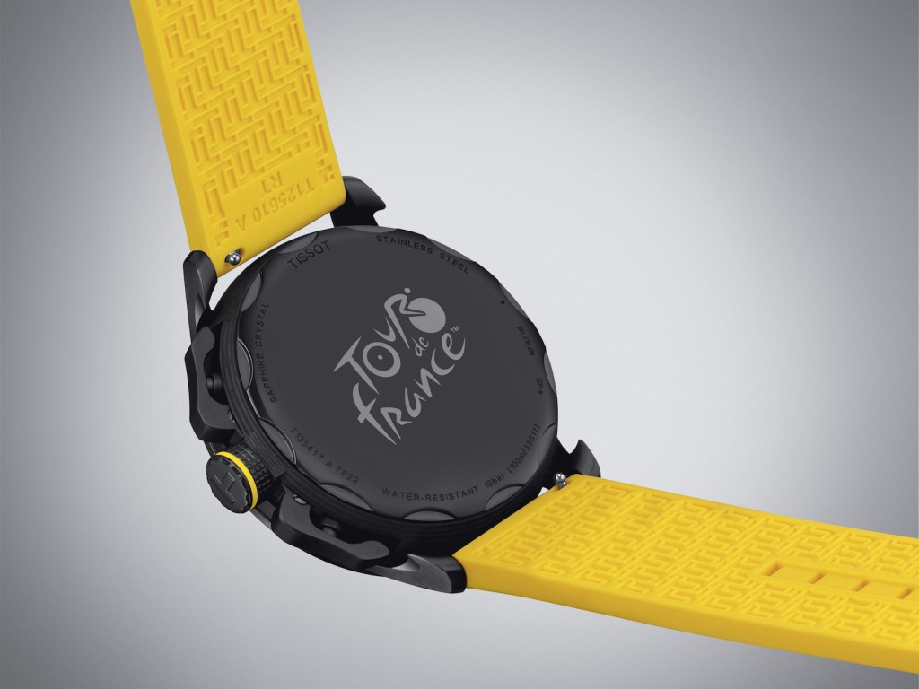 The 2023 Tissot T-Race Cycling timepiece embraces a classic design with some cycling touches on board. The watch push buttons resemble the brake gears while the hands of the watch evoke the spokes of the wheel. The bottom of the case reveals the logo for the Tour de France in yellow and in red for the Vuelta, Spain’s equivalent of the race.