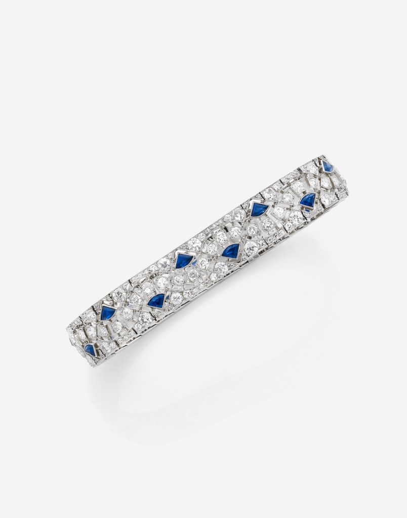 Left: This Mauboussin major Art Deco brooch in platinum, gold, engraved emerald and diamonds, circa 1930 is estimated at US$28,000 to US$34,000 (20,000 to 30,000 euros). Photo courtesy Artcurial. Handout via The Gourmet Gazette. Right: This Van Cleef & Arpels Art Deco platinum ribbon bracelet decorated with sapphires and diamonds, circa 1925, is estimated at between US$ 28,000 to US$34,000 (25,000 and 30,000 euros). Photo courtesy Artcurial. Handout via The Gourmet Gazette