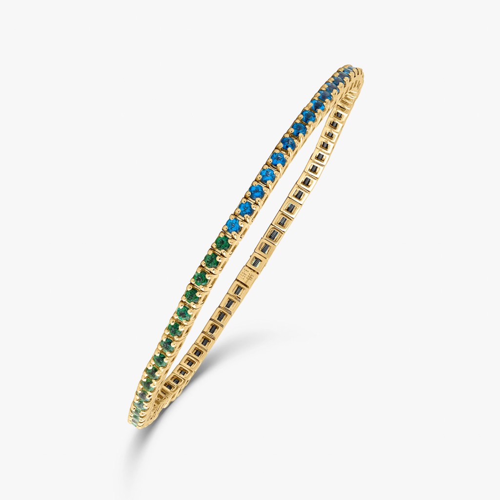 Paris, France — A rainbow of sapphires, blue topaz, diamonds and amethysts sparkle on the 14k gold jewels in the Shiraz collection from the Parisian house of Ashaha. Chokers and bangles and finger rings that can be worn alone or stacked together to form an ensemble. The collection draws its inspiration from the way Berber women wear their jewelry with dozens of bracelets on their arms and cascading necklaces around the neck. Here in this collection the sparkle of the gemstones catches the light and the eye.