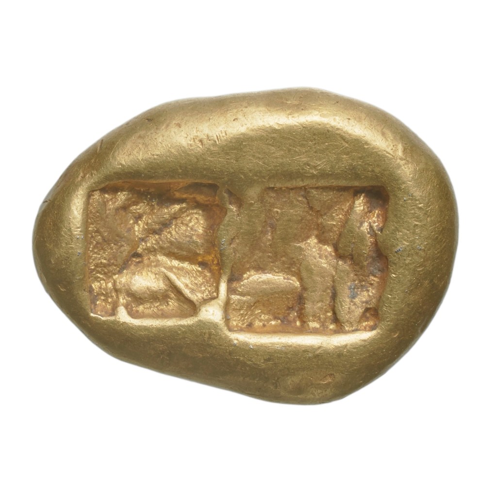 It all opens up with the story of Danaë being showered in gold by Zeus illustrated by an oil on canvas of the mythological character and a Greek vase from Antiquity, circa 430 B.C. Objects in gold can be traced back at least to the fifth millennium B.C. and gold was regarded as a treasure yet sacred as well. The Mesopotamians created their first jewels in gold circa 2600 B.C. The ancient Egyptians used it to decorate the tombs of their kings. The first gold coins appeared in 630 B.C. in Lydia under the legendary reign of Croesus. The Lydians invented metallic coinage and were the first people to establish permanent retail shops. Croesus, the last king of Lydia, was know far and wide for his great wealth. A piece of Lydian gold currency emanating from La Monnaie’s historical collections and dating from circa 561-541 B.C., in other words during the reign of Croesus, is on display in the exhibition.