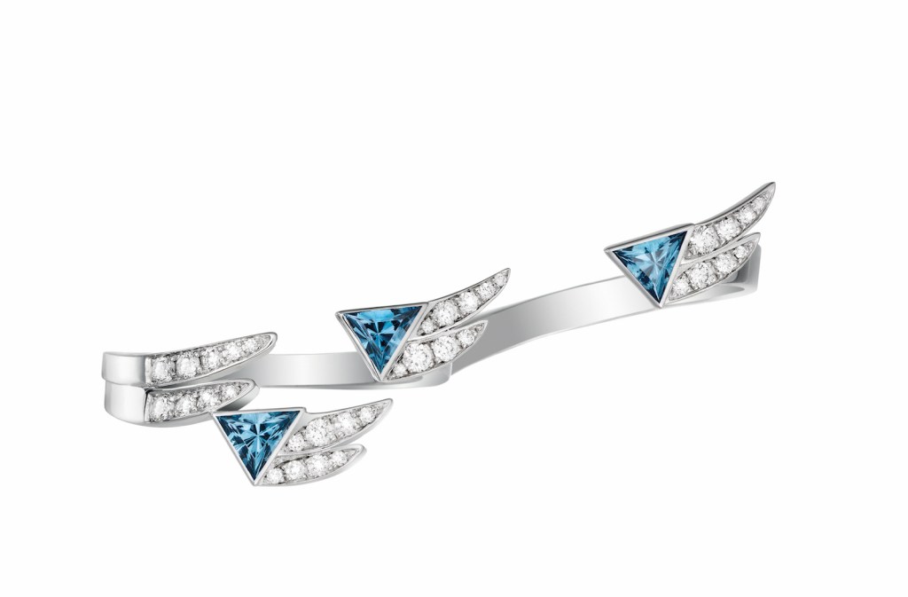 Paris, France — It is a parade of colors from the Parisian jewelry house of Akillis. Deep greens, London blues and heady purple mark the collection called Spread Your Wings, described by the house as a tribute to freedom. Set in white gold, the rings and earrings seemingly fly over your ears and fingers. The colored gemstones are set off with diamond paving and the pieces are artfully shaped into feathered-wings. But the most glamorous piece in the 15-piece collection was clearly the eye-catching ear cuff.