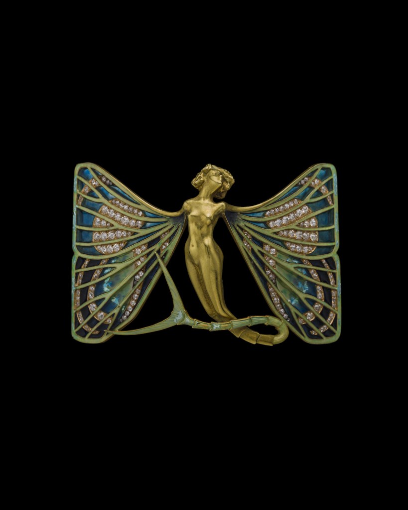 There is the sphinx brooch from René Lalique in rock crystal, gold, enamel and diamonds. Georges Fouquet’s seascape comb is a wonder world of gold, tortoise shell and abalone mother-of-pearl. A brooch depicting a woman and an enchanting floating octopus by the jeweler and goldsmith Louis Aucoc delighted many of the visitors while René Lalique’s brooch with four fireflies fascinated. Other jewels feature winged fish and entwined dragons. And a mysterious sylph, wings spread, revealing gold, enamel and diamonds is a highlight of the show. « Art Nouveau was able to poeticize the world and make people dream, » commented Rossella Froissart, the exhibition curator in an interview.