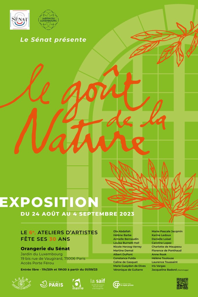 Paris, France — It is one of the lush, nature-filled places in Paris, the Luxembourg Garden home to the French Senate, an orchid collection, a fruit orchard and honey-producing bee hives. It also houses a picturesque Orangery or Orangerie in French, conservatories or green houses to protect orange and other fruit trees in the winter. The Senate’s Orangerie dates from 1839 and houses some 180 plants. But it is as well a fine exhibition space and starting on August 24th it will be showcasing the works of the Artist’s Association of the 6th arrondissement (Le 6ème, Ateliers d’Artistes ) which is celebrating its 30th anniversary this year and like the Luxembourg Garden is located in the 6th arrondissement or district of Paris.