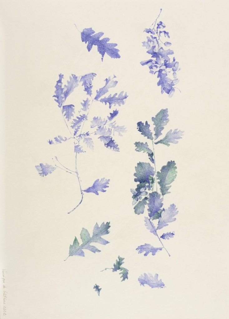 Entitled Le Goût de la Nature (A Taste of Nature) the show brings together 21 professional artists of the association working in myriad mediums including sculpture and painting. The exhibition also features works of member artists who are no longer with us. There is an intriguing and colorful work by Albert DuPont entitled Landscape of Being, Hommage to Monet, Marie Gueydon de Dives is presenting a sculpture of earthenware jars made with clay collected from just outside her studio and there is an uplifting drawing in blue and green depicting oak leaves by Véronique de Guitarre.