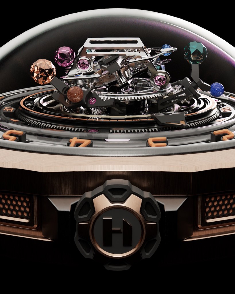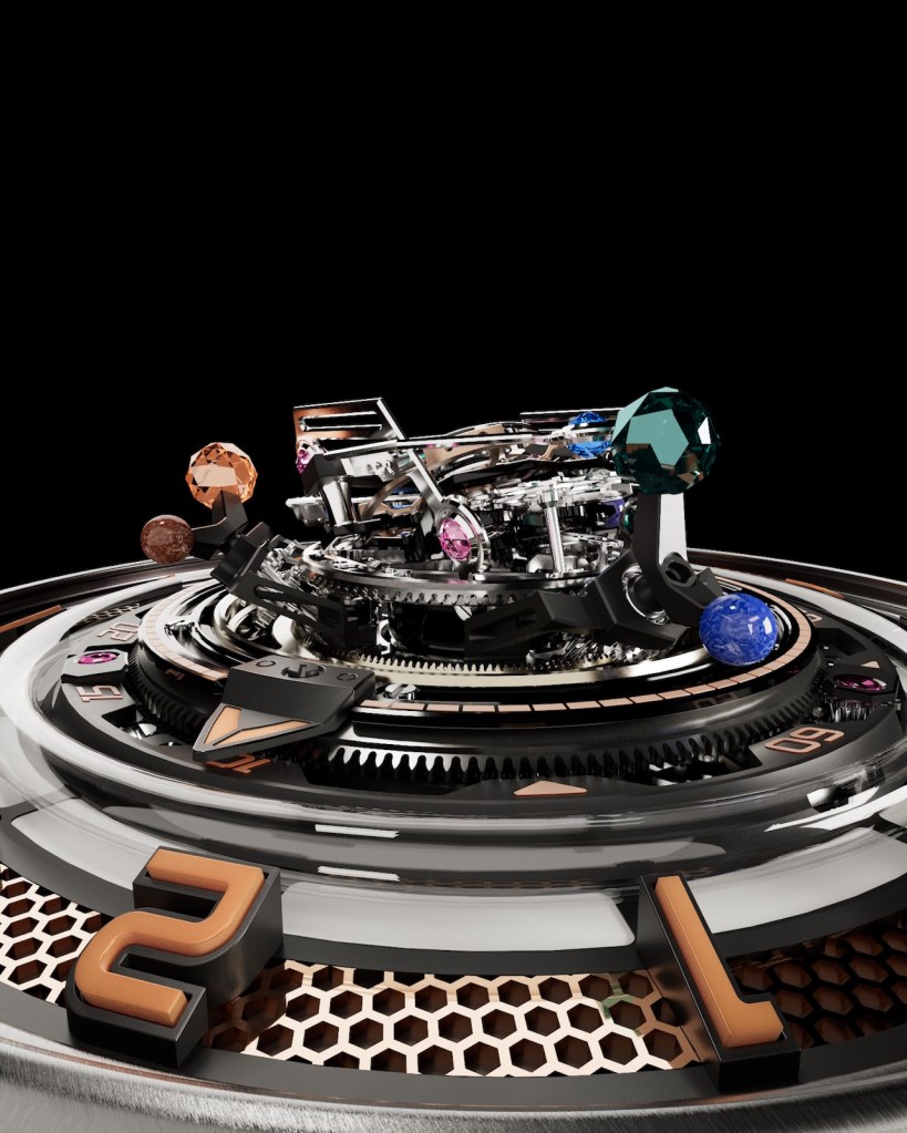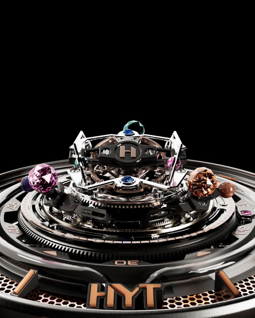 Nestled around its periphery, three exceptional faceted sapphires, each 2.5 mm in diameter, magnify the life force emanating from this breathtaking visual watch – a perception itself amplified by the almost imperceptible, airy sound of the tourbillon. These distinctly colored gems – fuchsia, blue-gray and yellow – rotate at different speeds. The first, the fuchsia gem, completes 4 revolutions per minute (rpm). The second, the blue-gray one, rotates at 5 rpm, and the last, yellow, at 6 rpm. Each of these dazzling spheres is tracked by a counterweight, of a distinctive color and finely finished in miniature paint. The tourbillon’s visual impact is enhanced by six smaller sapphires, each 1.5 mm in diameter, set in the tourbillon’s brackets. The timepiece is being brought out in a limited edition of 8 and the purchasers of the seven remaining watches can choose their sapphires from a selection proposed by the house. Special to The Gourmet Gazette. https://www.hytwatches.com/
