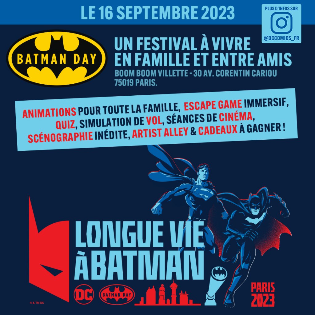 Paris, France — It’s that time of year again, a day dedicated to one of DC Comics most famous superheroes. Batman Day is being celebrated by fans around the world on September 16th. Batman remains the legendary caped crusader to this day. Special celebrations are being held throughout the world. In Paris, a special Batman Day, for example, is on the agenda in the Boom Boom Villette shopping mall bordering on the Villette Park on the eastern edge of Paris. A multitude of events are on the agenda, reminding us that Batman lives on forever. The Batmobile will be on the esplanade in front of the mall. Escape Games with two immersive experience, The Joker and the Batcave, are bound to be a hit while conferences, quizzes, readings, screenings and Superman himself are all part of the plan. The Grand Rex movie theatre in Paris will also be projecting Batman movies throughout the day.