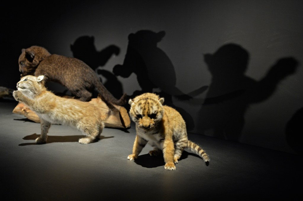 The museum possesses one of the most extensive collections of naturalized animals in the world and the cats, great and small, are no exception. The exhibition brings together 150 objects including 80 naturalized felines. The visitor discovers the ingenious characteristics of the feline: they all purr and no one has formally figured out why, when and how. Contentment, stress, does purring heal? Studies abound. The show underscores the unique features of felines, notably their highly developed senses. They also possess vibrissae, better known as whiskers but which are also found on their cheeks, chin, above the eyes and at the back of their back paws. These are specialized organs that enable them to detect nearby objects and to move around in the dark without bumping into things, like we would. Felines also have night vision.