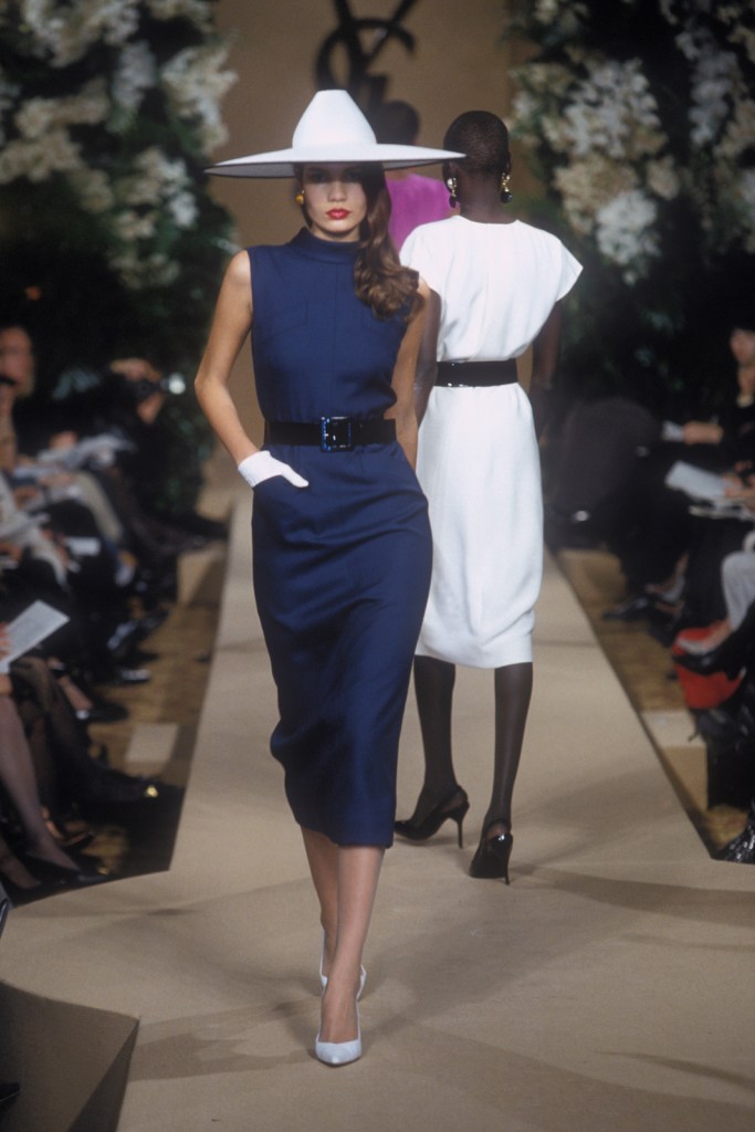 Left: Two-tone evening dress in elegant black and white worn by model Nicole Dorier, couture collection Autumn-Winter 1981. ©Yves Saint Laurent ©All rights reserved. Handout via The Gourmet Gazette Right: White evening dress trimmed with a black ribbon effect worn by model Shiraz Tal, couture collection Fall-Winter 1998. ©Yves Saint Laurent ©Guy Marineau. Handout via The Gourmet Gazette