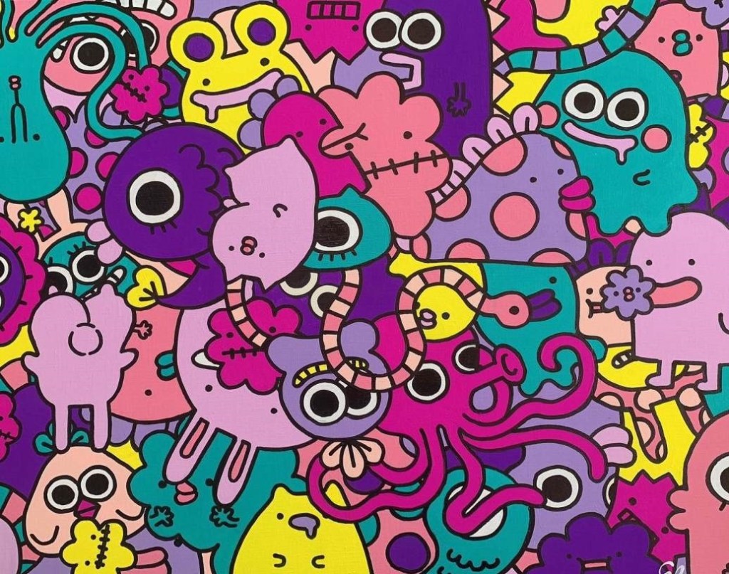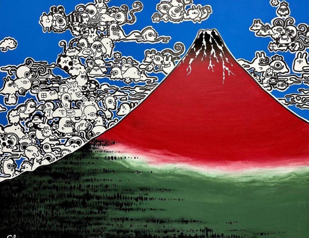 Paris, France — These are joyful, uplifting works, something we can all use a dose of right now. Colorful critters sometimes riding on the crest of a wave have come to Paris via Japan with the chibi-chans of Elena. Her chibi-chans are small fictional creatures which she first conceived in her childhood. Chibi is a Japanese word meaning a small person, baby or child. Elena’s little people are seemingly in constant motion and the artist pays tribute to the great Japanese artist Hokusai with her various paintings of Mount Fuji and the Great Wave off Kanagawa, a woodblock print and perhaps the best known of Hokusai’s works.
