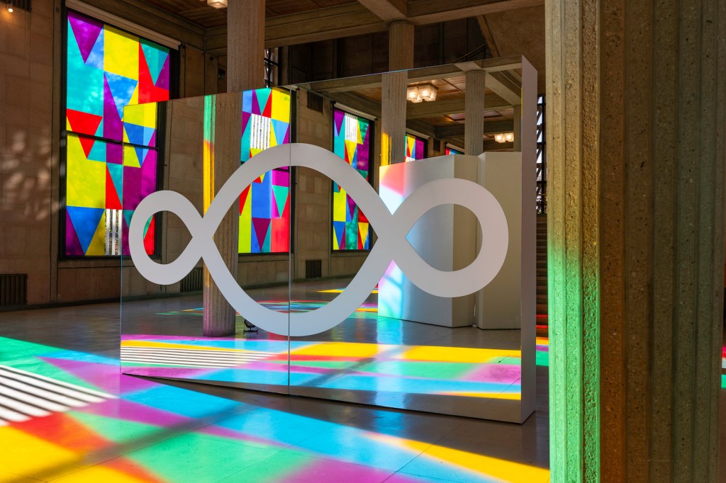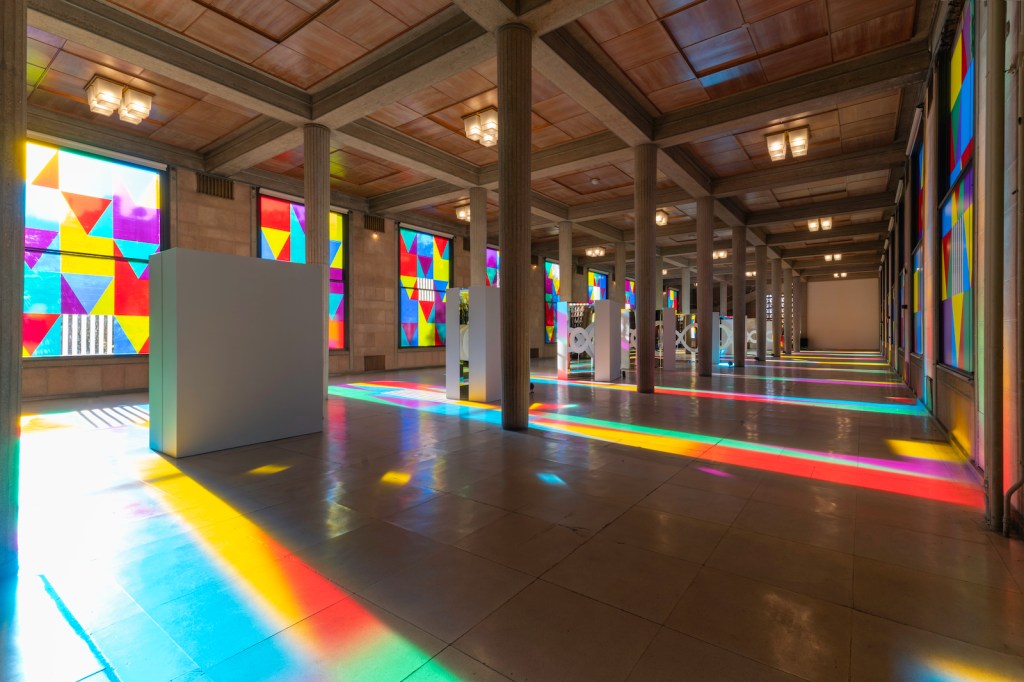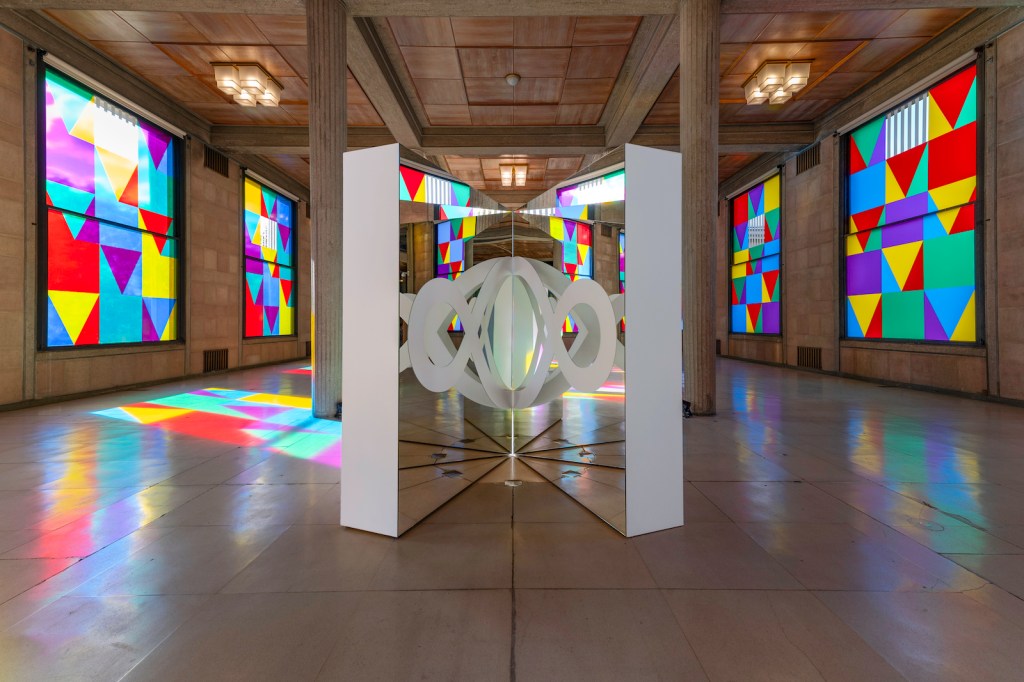 Paris, France — They are two of the greatest contemporary artists out there in the field today and their works are being juxtaposed inside a luminous 20th century architectural masterpiece, the Palais d’Iéna, which was designed and built by Auguste Perret in 1937 and is the only concrete palace in Paris. Daniel Buren presents his Allegro, Ma Non Troppo Travail in Situ, a series of transparent mosaic-like wall installations which let the light from the outside flow freely inside all the while casting colorful shadows on the floor and being reflected in the large mirror art installations of Michelangelo Pistoletto. His work Divisione-Moltiplicazione, 1973-2023, offers a key outlook on the divisions and multiplication of forms and light and which include the viewer and what is going on in real time in the work through the reflexions in his mirrors, which in the sunlight turn into something reminiscent of gold. The end result is a colorful cathedral reflected in Mr. Pistoletto’s giant mirrors which are endowed in the middle with his famous symbol of three curves representing the Third Paradise, the third phase of humanity, a balanced connection between artifice and nature.