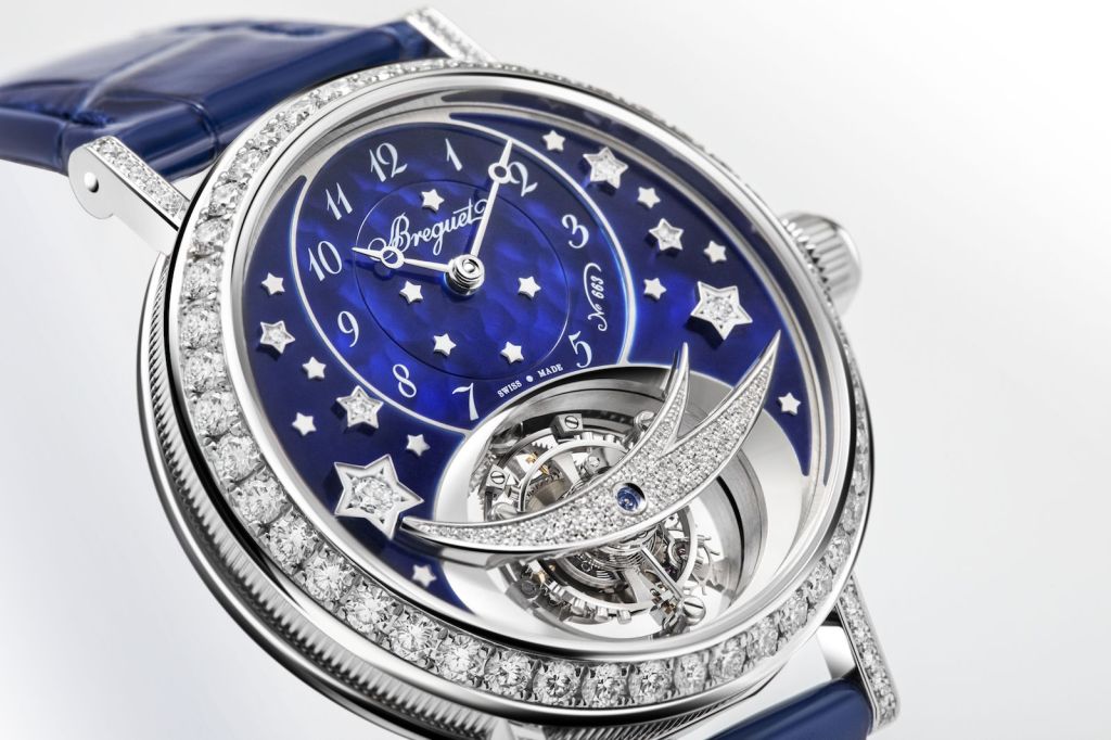 A lush mother-of-pearl dial in midnight blue, dramatic dustings of diamonds, sparkling stars, a diamond paved dial and the brilliantly decorated tourbillons, a mechanism developed by the Swiss-French watchmaker Abraham-Louis Breguet and patented by Breguet in 1801. The house of Breguet has just added two new versions of its dashing tourbillon into its Classique Tourbillon 3358 collection. These timepieces are outfitted with dials that dazzle and within contain the great watchmaking mechanism that is the twirling tourbillon.