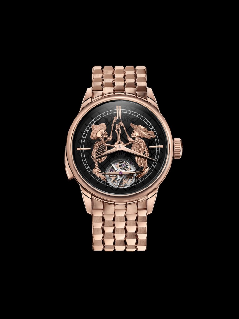 This unique piece, nestled into a 42mm case, is in rose gold with an onyx dial featuring sandblasted motifs representing the traditional Mexican elaborate decorative craft known as the «papel picado» and hand-engraved rose gold appliques representing one of Mexico’s most famous symbols: calaveras, a representation of a human skull or skeleton within the context of the Day of the Dead,- inspired by those of the Mexican muralist Diego Rivera – in particular his emblematic catrina, a richly decorated female skeleton. The Mexican celebration of the Day of the Dead, usually celebrated on November 1st or 2nd, is an irreplaceable tradition, and has the particularity of giving a positive approach to death and the afterlife. This is why skeletons are always painted with a smile or a joyful action, the idea of which has been taken up on the dial of this unique piece: the dancing couple symbolizing eternal love. Pierre and Jean-Claude Biver have united watchmaking tradition and Mexican tradition in a unique timepiece that pays tribute to high horology and Mexican culture through eternity.