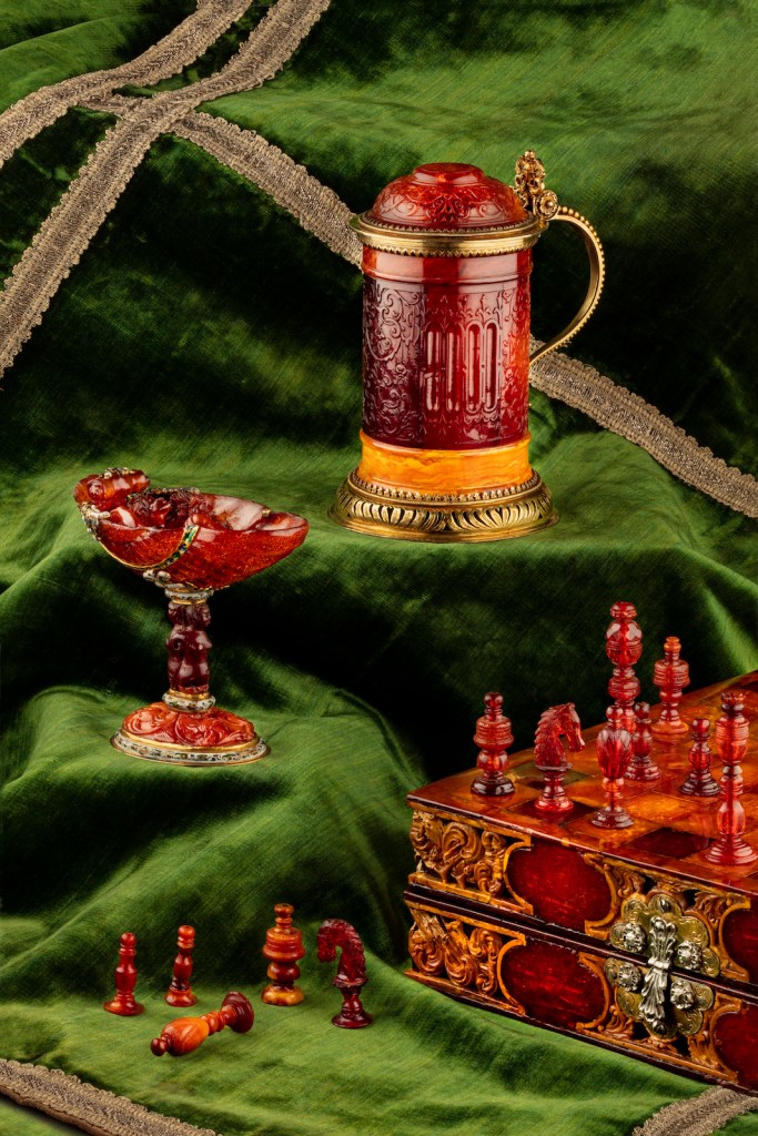 Baltic amber has been found in the Greek and Roman worlds, the tomb of King Tut in Egypt and all the way to China, offering a fascinating glimpse into the trade along the ancient Amber Road from the Baltic to the Adriatic. Baltic amber reached a peak in the 16th century when Albert of Brandebourg-Ansbach (1490-1568) or Albert of Prussia converted to Protestantism and transformed the State of the Teutonic Order into the Dukedom of Prussia. His physicians would publish the first books on the extraction of amber and its medicinal properties, including curing stomach ailments, heart disease, convulsions and general infections. In fact the very first book written on amber in 1551 concerned its medicinal properties. Albert de Brandebourg-Ansbach signed a contract, in exchange for a usage fee, for the exclusive extraction of amber with Jan Janski, who hailed from Dantzig. This marked the beginning of an extensive trade in and production of art objects in amber. They were to become the great diplomatic gifts of Prussia and were sought after to decorate the curiosity cabinets of the sovereigns and princes of Europe.