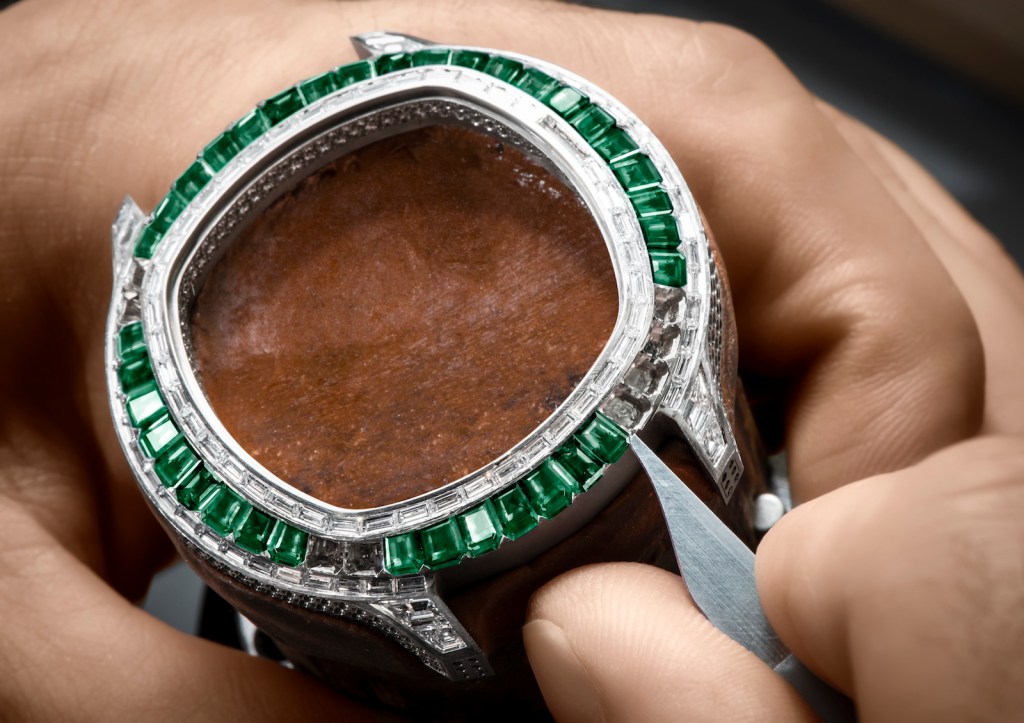 The timepiece’s 18k white gold case is set with green emeralds and diamonds, is water resistant to 100 feet (30 meters), has a power reserve of 40 hours and is outfitted with a green leather alligator strap and its 18k white gold buckle set with diamonds. Special to The Gourmet Gazette. https://www.piaget.com/ww-en