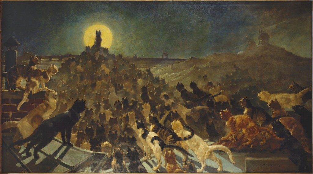To mark the centenary of his death in 1923, the Musée de Montmartre is devoting an exhibition to this emblematic and singular artist of Montmartre. The show brings together a selection of one hundred works, including a large proportion of his oil paintings which are less known than his graphic works (namely the cat posters). The cats are all there of course including the compelling and rarely seen Apotheosis of the Cats, resembling a kind of feline mass centered around one lord-like black cat illuminated by a full moon. Steinlen’s figure of the cat was depicted as a symbol of freedom and an emblem of social outcasts.