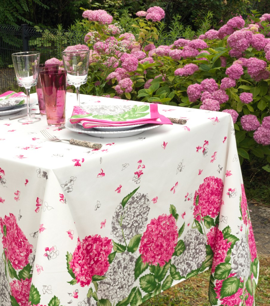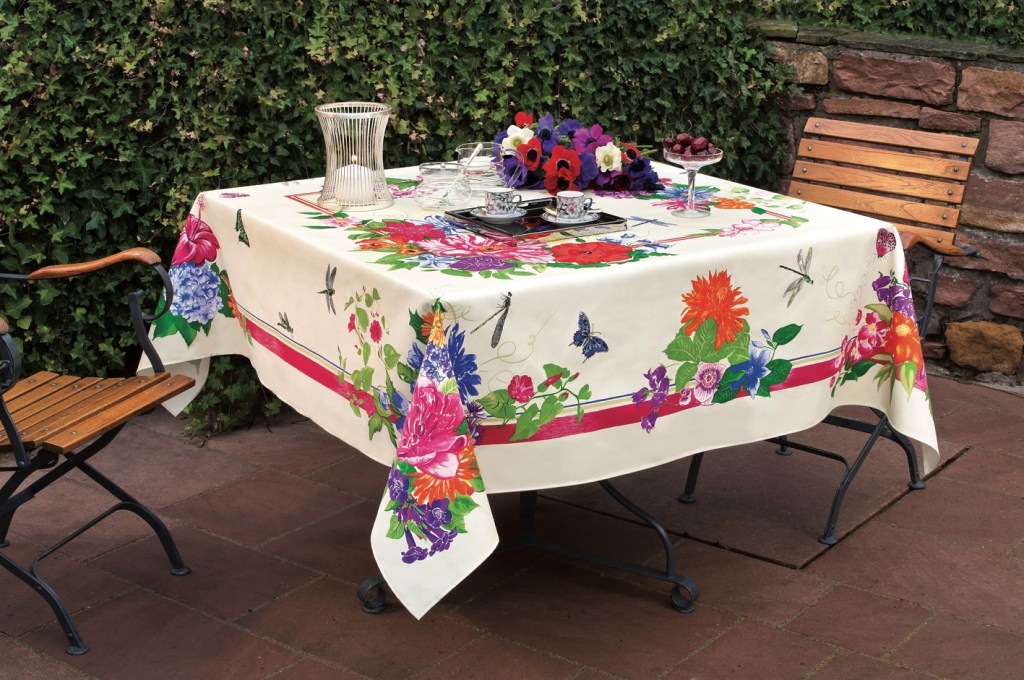 Hortensias, butterflies, poppies, dahlias, daisies and dragon flies are all making their way to the table offering a festive mealtime outing and a sneak peak into springtime. In a stunning display of the art of French table arts, the house of Beauvillé has decidedly decided to invite flowers to town and country proffering up a beautiful table setting. A meal becomes a journey into an enchanted garden with myriad flowers and colors with the house’s five new designs: The Poppies, The Hortensias, The Gardens, The Palais Royal (the Royal Palace) and The Summer Garden. The square table cloths are complemented by matching napkins all in printed Beauvillé cotton, resolutely Made in France.