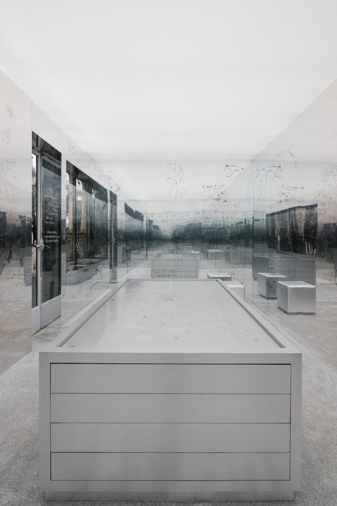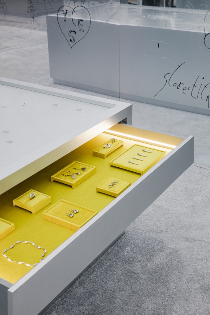 The project’s narrative flows around the concept of a fountain as a repository of memories where they are conserved and brought back to life. The fountain in the center of the silvery cave-like space is a nod to the French tapestry, “Woman Bathing Surrounded by Attendants”, created circa 1500 by an anonymous master. The fountain serves as a display for the silver pieces from the latest collection by Avgvst jewelry x Crosby Studios, a study of coins and furniture of the past. For a closer glance at the jewelry, visitors are invited to dip their hands in the fountain’s waters, kept pristine by an attendant who constantly surveys it. Harry Nuriev and Avgvst present a reflection on classicism, which they describe as the longing for the perfect order in the ever-changing reality. Echo, a new collection by Avgvst is also on display. The silver and gold pieces, inspired by archive objects, are echoes of the past.