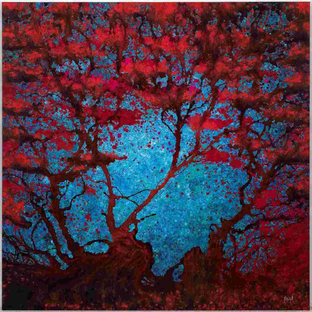 It is a fitting title for the show as arborescence refers to any tree-like structure, usually somewhere between a shrub or a tree. The tree, the essence of nature. Pierre-Luc Poujol doesn’t only paint nature he uses it in his works of ethereal complex beauty. He makes his own tools for painting with tree branches and often makes his own pigments. The artist draws his inspiration from painters like Joan Mitchell and Jackson Pollock and his works are meant to incite people to look up since we are looking down most of the time now, he explained in a recent interview.