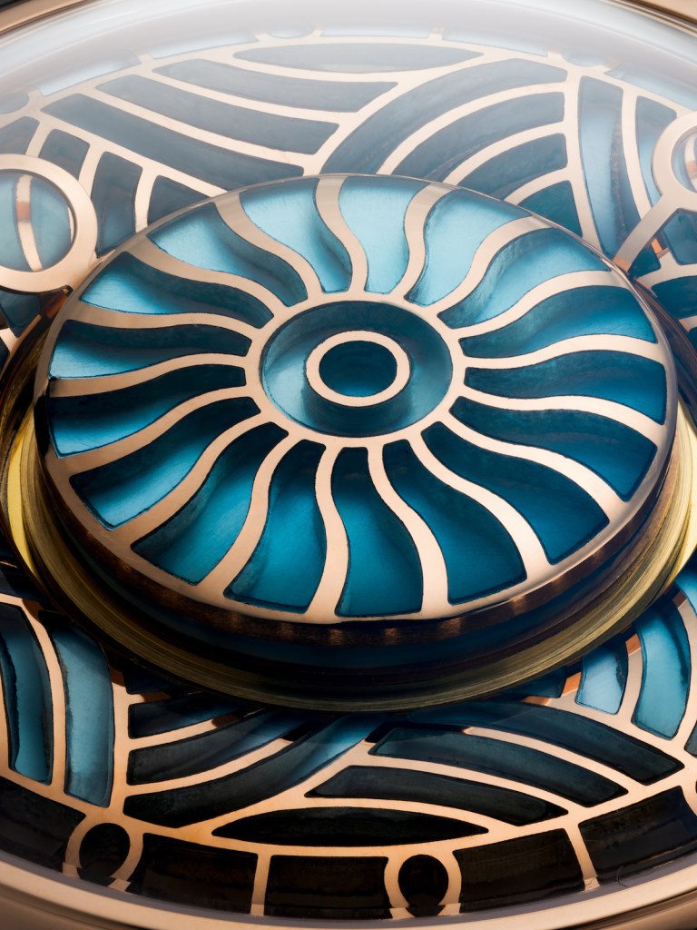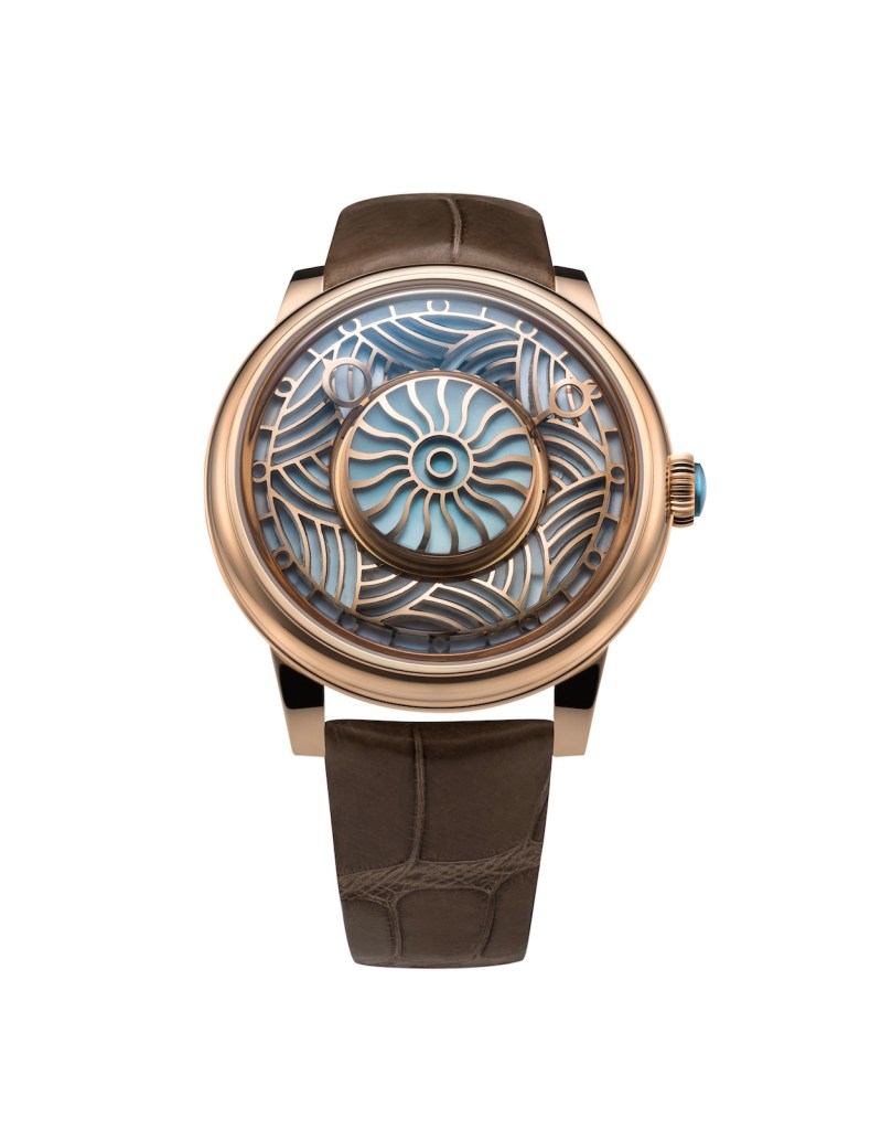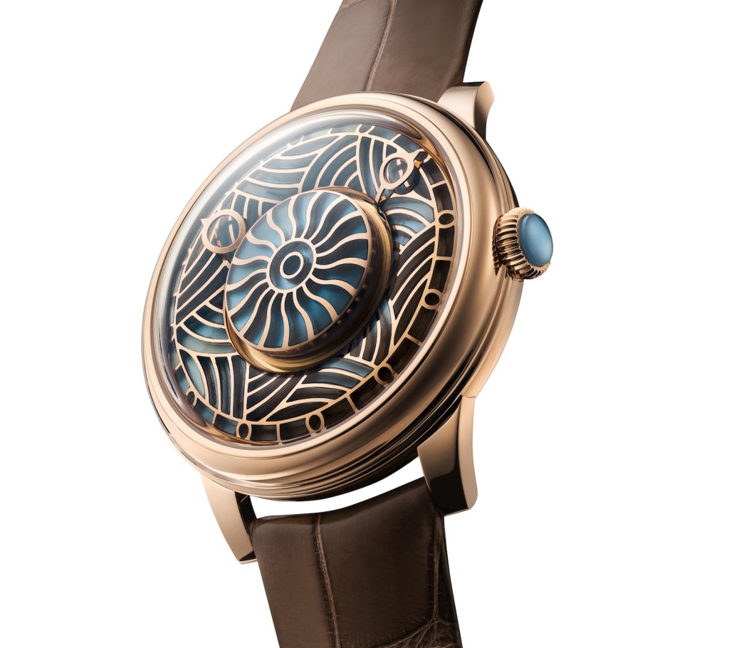 The dial is boldly bold. Based on a stained glass window design with gold replacing the lead found in stained glass windows. It is set with 68 miniature components of aquamarines selected for their purity and delicate color, meticulously hand-cut and nestled within an intricately laid gold lacework. Each stone, patiently shaped and fitted by hand in the brand’s Montreal, Canada workshop, reflects light in a unique way thanks to a disk of mother-of-pearl positioned beneath the stone. This provides a lavish decor for Vianney Halter’s famous mysterious automatic entirely Swiss-made movement. The caliber’s innovative design is highlighted by a patented ‘invisible’ rotor that allows for an unobstructed view of its intricate inner workings. With a power reserve of 56 hours, its ingenious architecture allows for the addition of extra modules. For the Beauregard Ulysse watch, this translated into a reinvention of the time display. Here, the hour and minute hands rotate not from the center. Have a look.