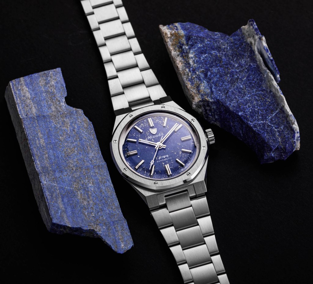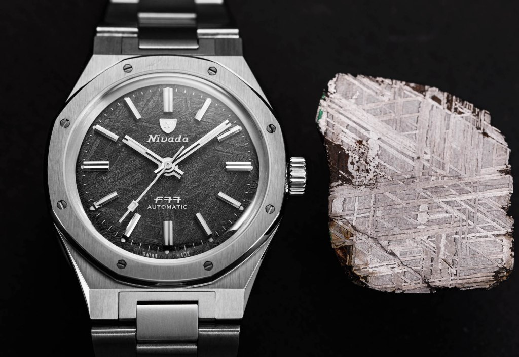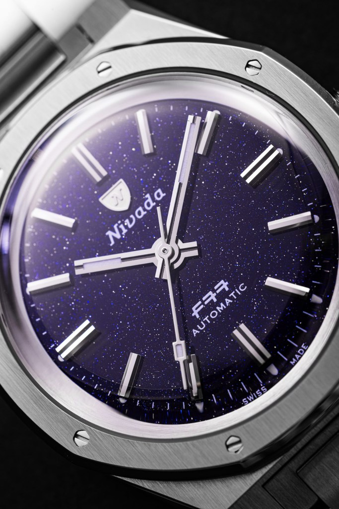 Geneva, Switzerland — In our ongoing coverage of the Watches and Wonders watch fair and its surrounding events we bring you Nivada Grenchen’s latest versions of its iconic best selling stainless steel icon, the F77, and a surprise is in store: the stainless steel on two of the new versions has been traded in for lightweight titanium while the watch has been brought out with 37 mm eye-catching dials in stars of the mineral world. There is the Titanium grade 5 in Anthracite beautifully basket weaved, the stainless steel Aventurine in a beautiful, glittering hue, the stainless steel Lapis Lazuli, superbly stunning with an additional limited edition available only during the pre-order period and last but not at all least, the Titanium grade 5 Meteorite, with its sprawling face from outer space.