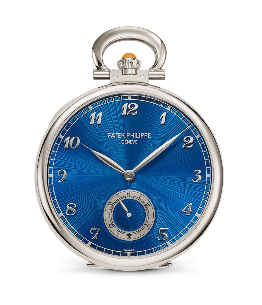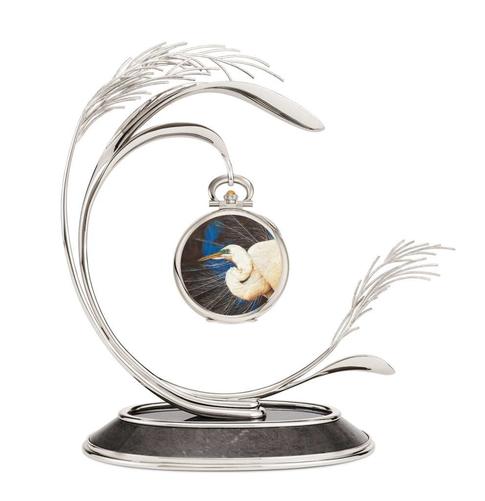 Portrait of a White Egret — Pocket watch in wood marquetry by Patek Philippe. This unique piece featuring a case back in wood marquetry gives center stage to a white egret and its delicate ornamental plumage, the details depicted with extraordinary finesse. The marquetry-maker cut out and assembled a remarkable 53 tiny veneer parts and 400 inlays, together spanning a palette of 18 species of wood of different colors, textures and veining. The gold dial was hand-guilloched with a sunburst motif recalling the plumage and coated with translucent blue enamel, according to the traditional technique of flinqué enameling. Applied Breguet numerals and leaf-shaped hands, all in white gold, indicate the time. An orange opal cabochon (0.29 ct) echoing the golden color of the bird’s bill embellishes the crown. This pocket watch is accompanied by a handcrafted stand in white gold decorated with a motif inspired by reeds, on an oval base in silver obsidian. It houses the caliber 17’’’ LEP PS manually wound movement with small seconds. Photos courtesy Patek Philippe. Handout via The Gourmet Gazette